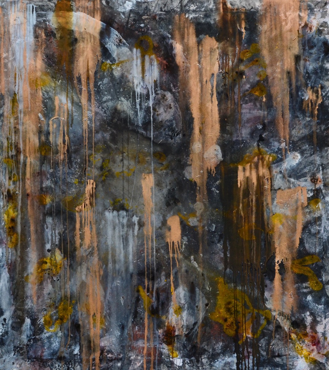 BrIA-116 Published April 26, 2019 at 2508 × 2819 60”x54” , Dye, Oil, Acrylic, Ink, Pigment, Latex, Cement, Liver of Sulfur, Fibers, Charcoal and Corrosive Metals on canvas, 2019