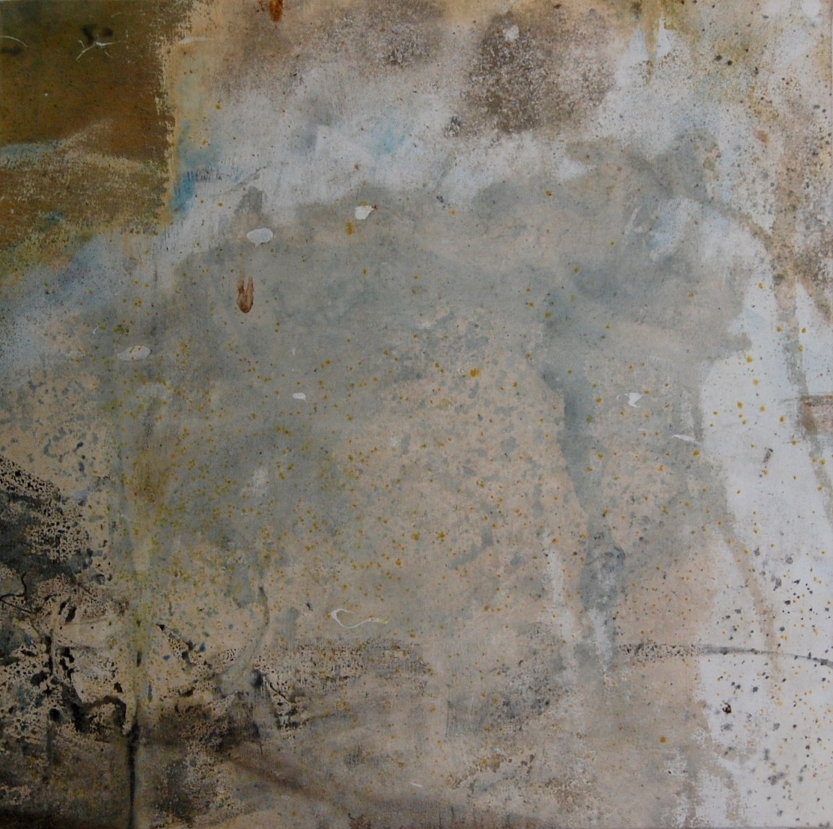 Cement 2 Published August 20, 2015 at 1480 × 1474 24”x24” , Dye, Acrylic, Bleach, Potassium ferricyanide and Ferric ammonium citrate, corrosive metals on canvas, 2015