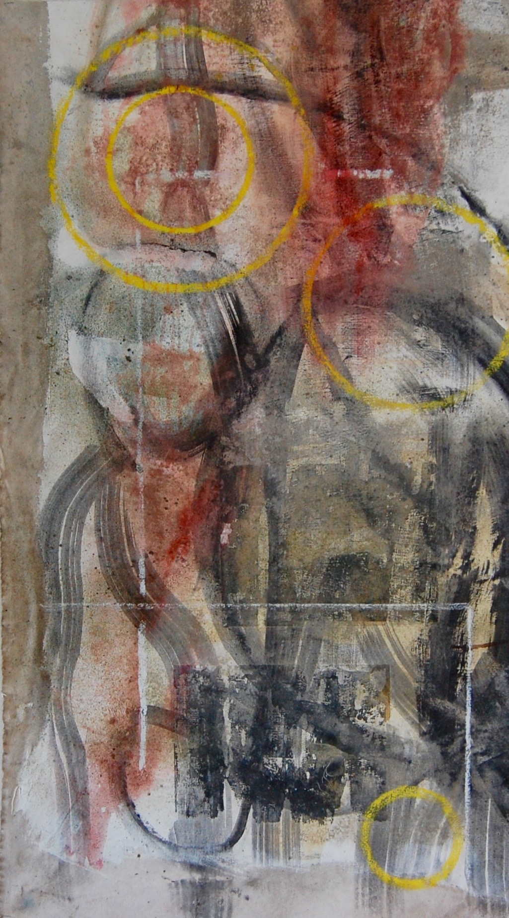 Cement Relic 2 Published August 20, 2015 at 1025 × 1846 48”x24” , Dye, Acrylic, Bleach, Cement, corrosive metals on canvas, 2015