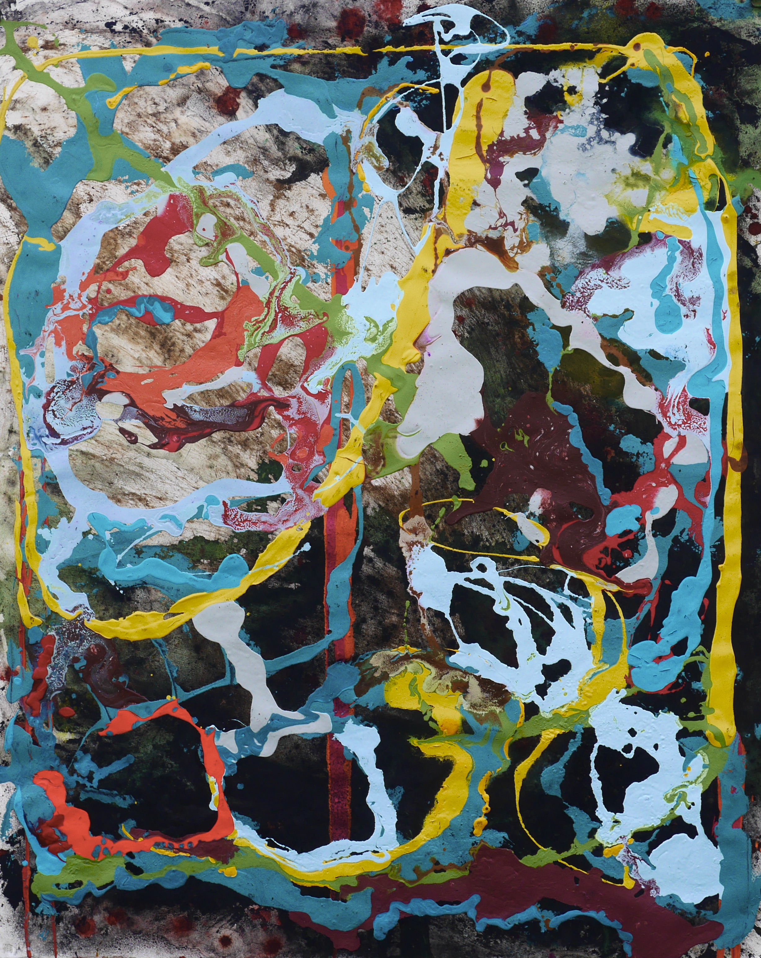 QUST10n Published October 9, 2021 at 2455 × 3088 60”x52” , Dye, Oil, Polyurethane, Acrylic, Bleach, Pigment, Latex and corrosive metals on Arches Aquarelle Rag 240, 2021