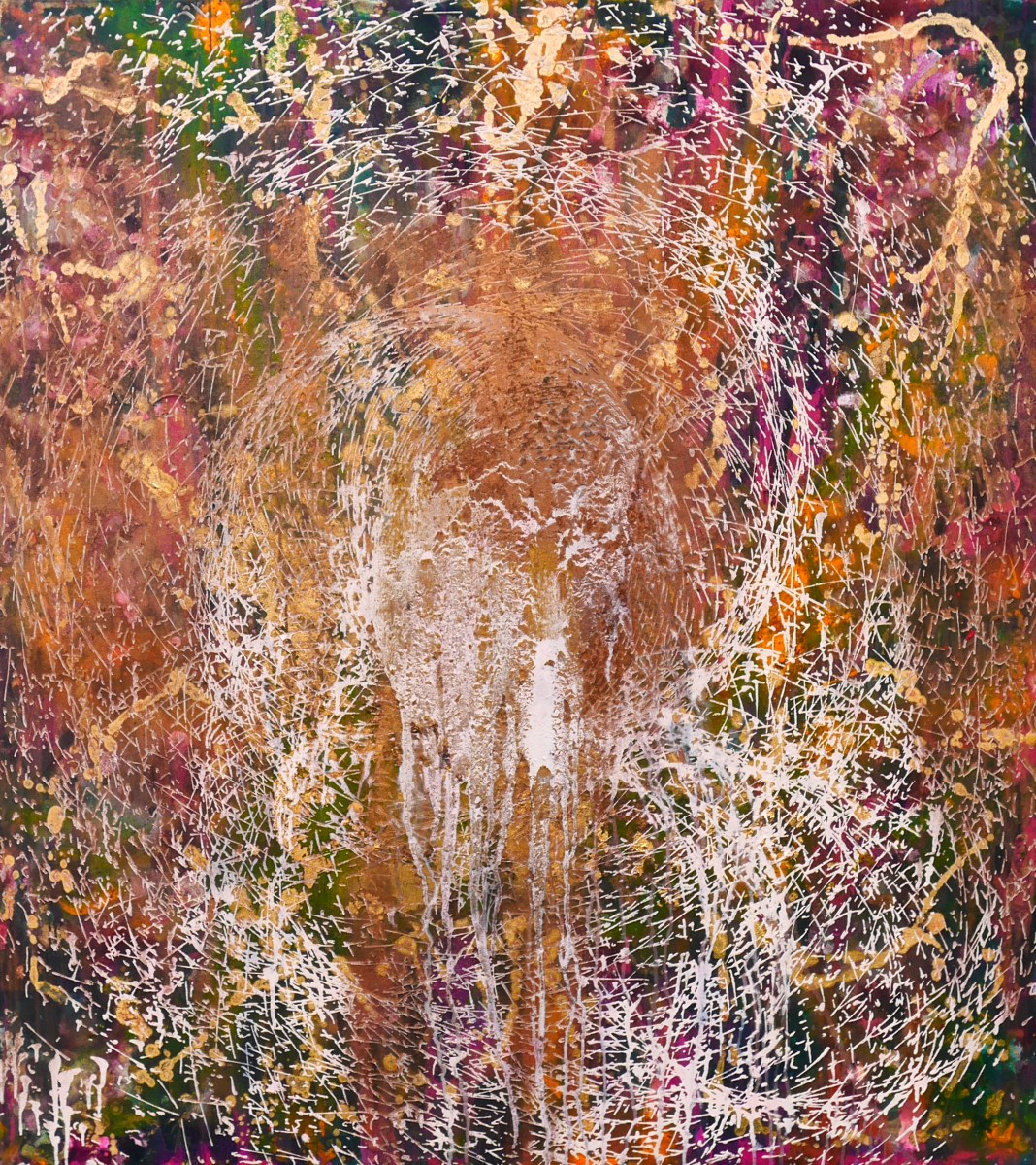 SHTTRD Published October 9, 2021 at 2347 × 2638 60”x48” , Dye, Oil, Acrylic, Bleach, Pigment, Latex and corrosive metals on canvas, 2021